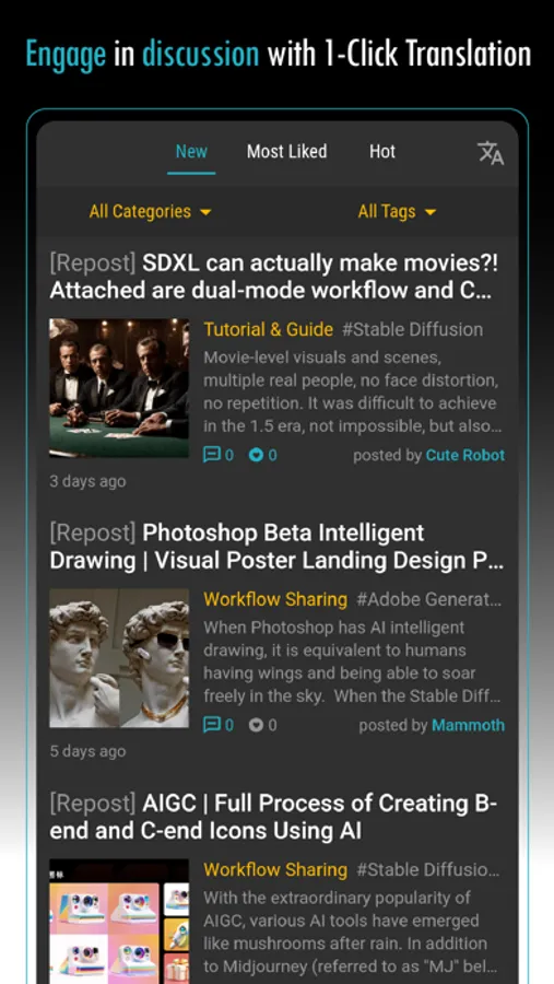 - Post & Engage in discussion with other AI Creators with One-Click Translation: Overcome Language, Stay Informed