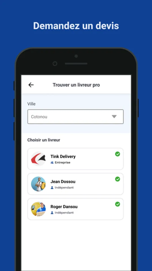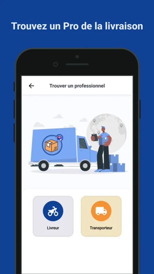 - Connectez vous à l'application pour rechercher un livreur professionnel qui s'occupera de votre livraison. L'application vous propose des livreurs selon la ville de votre choix afin de rendre flexible la durée de la livraison.