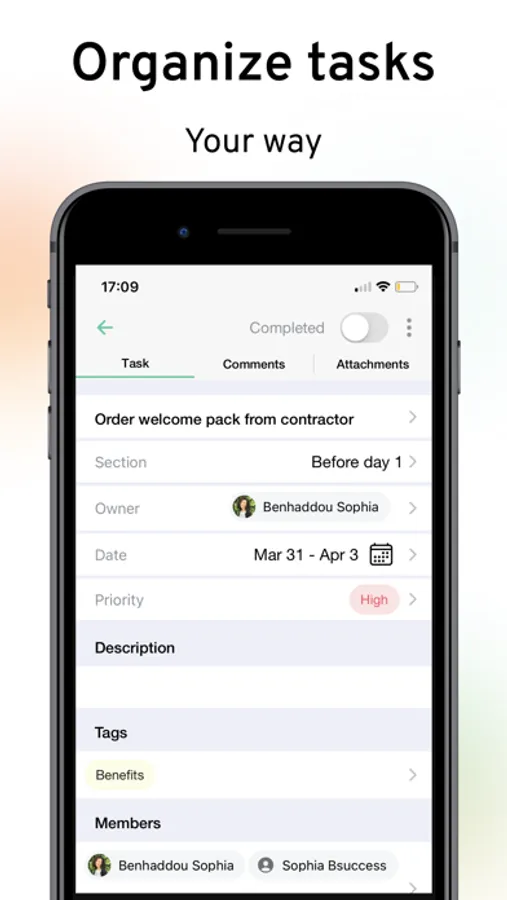 - Share files, pictures, and videos by attaching them to a task to keep your workspace organized and tidy
