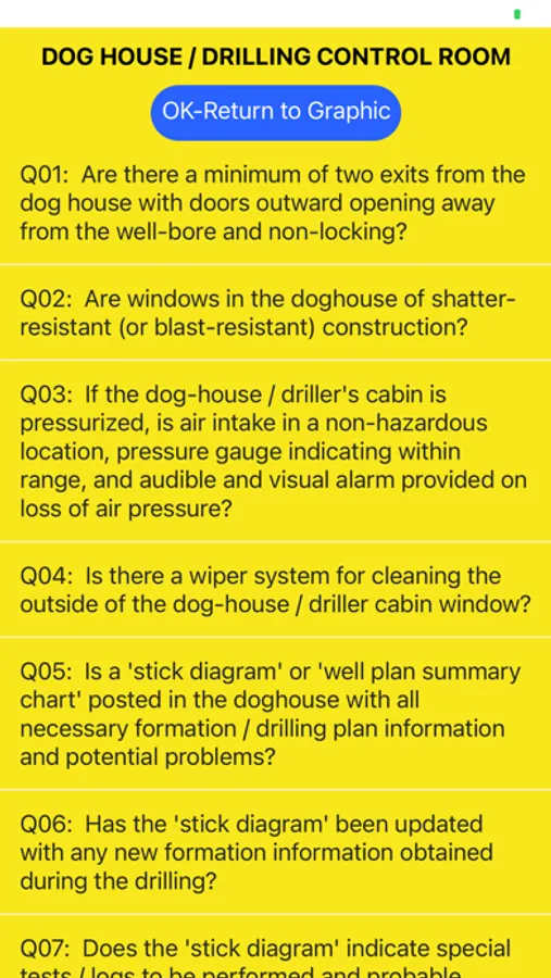 Dog House / Control Room (22 questions), e.g. "Is a 'stick diagram' or 'well plan summary chart' posted in the doghouse with all necessary formation / drilling plan information and potential problems?",