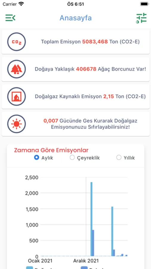 Bu yazılım kolay yapısı ile mevcut iş birimlerinize entegre olarak kurumsal emisyonlarını kolaylıkla takip etmenizi, emisyon kaynaklarınızın analiz sonuçlarını görmenizi ve bunları uluslararası standartlara uygun olarak raporlamanıza imkân verir.