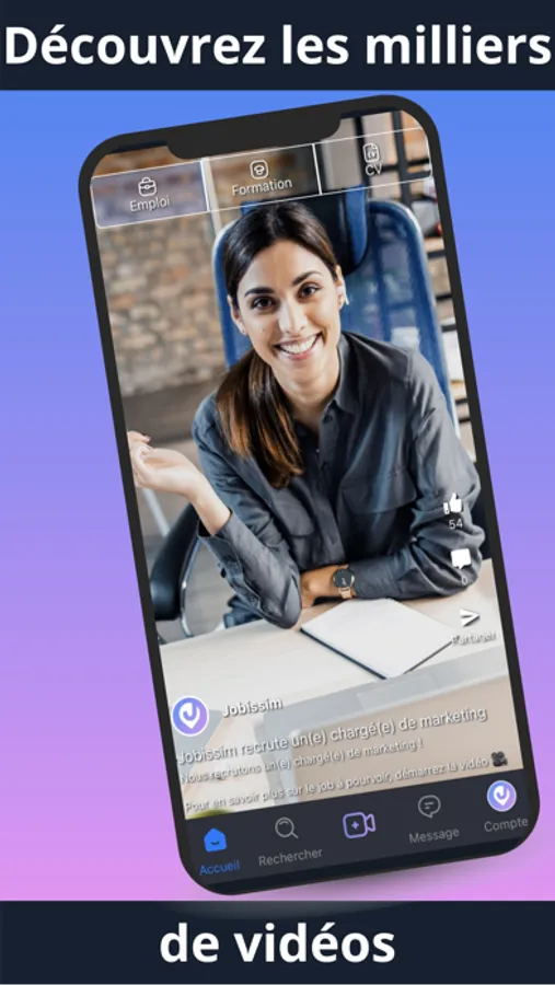 Jobissim targets your searches and offers you professional, relevant and interesting videos to suit your needs. Swipe the videos, the news feed allows you to find your job or your future collaborators in a much simpler, faster and fun way.