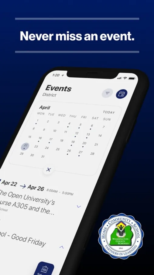 The event section shows a list of events throughout the district. Users can add an event to their calendar to share the event with friends and family with one tap.