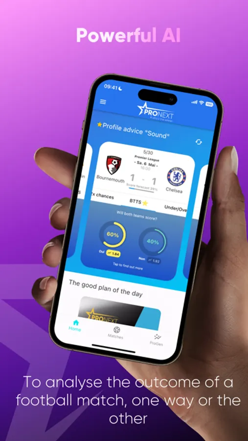 - the first app that uses powerful artificial intelligence to analyse the outcome of a football match down to the last detail (number of goals, player performance, frequent line-ups, series, team form, etc.) Everything that has tipped the outcome of a match one way or the other over the past 10 years in the 7 major leagues and European cups is in the ProNext AI engine.