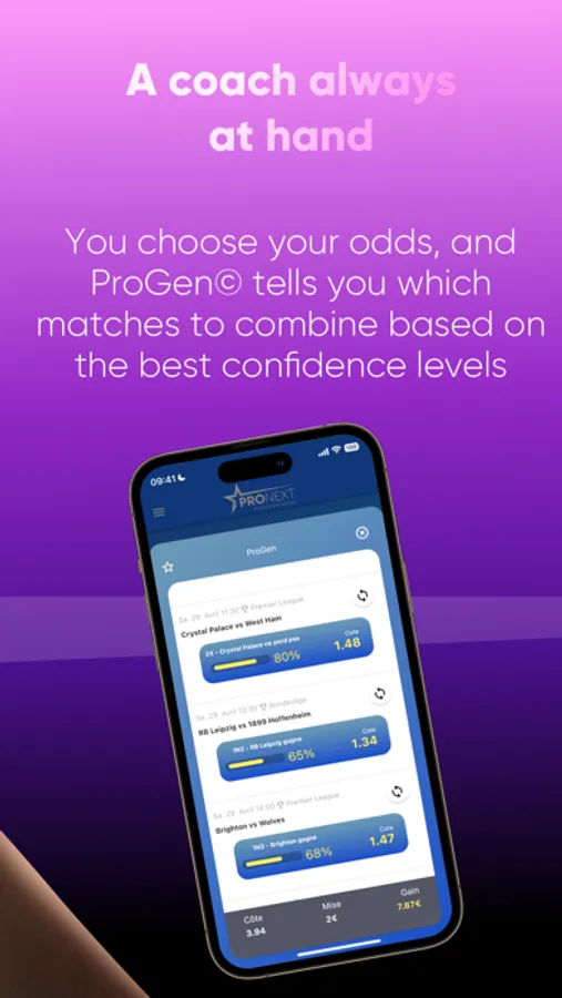 - A coach always at hand: You choose your odds and your winnings, and ProGen© tells you which matches to combine based on the best confidence levels.