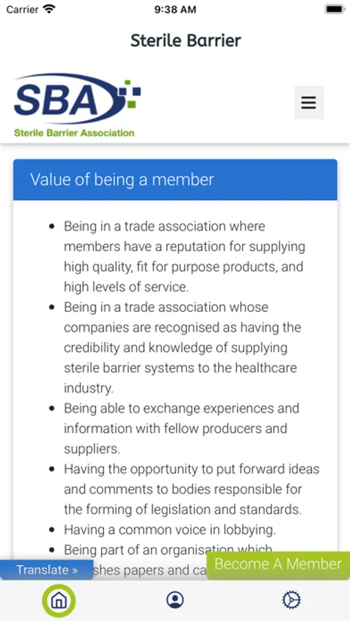 The Sterile Barrier Association (SBA) is the European trade association for companies who produce Sterile Barrier Systems (SBS) and associated equipment and accessories for the healthcare industry. SBS materials and equipment are sophisticated and allow single use and reusable medical devices to be sterilised after manufacture or after use. Sterilisation may take place at a medical device manufacturer or in the Central Sterile Supply Department (CSSD) of a hospital. In both cases the critical function of the SBS is to maintain product sterility up to the point of use.