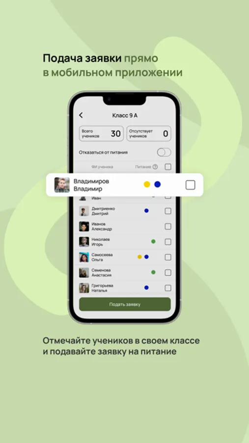 А учителям сервис позволит удобно отмечать детей в классе и быстро подавать заявки на питание.