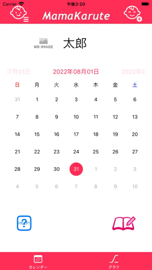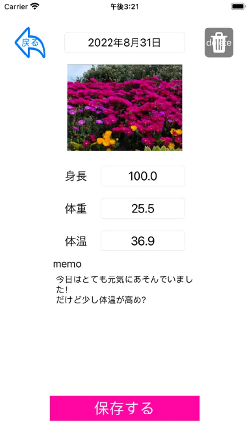 カレンダー機能を使い、身長・体重・体温やその日の体調などをメモしたり写真を追加することができます。