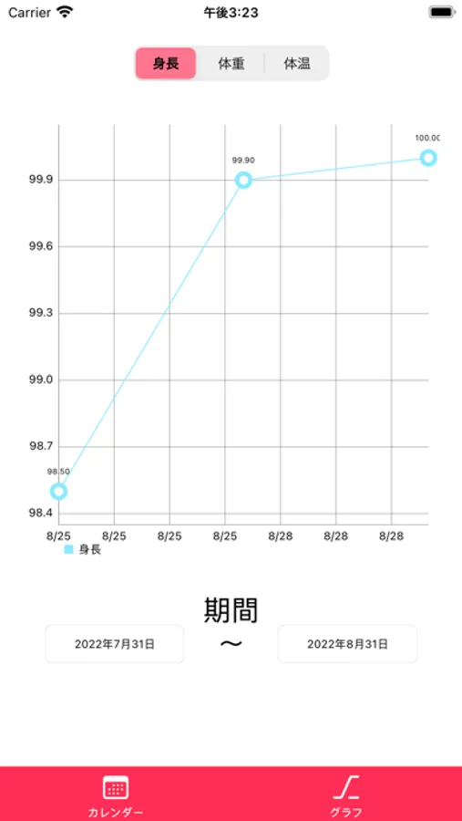 期間を指定することで身長・体重・体温の増減を簡単に見ることができるグラフ機能付き!