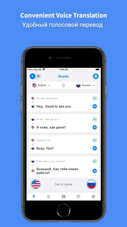 Hi ! RusGo is the leading russian Translator with a lot of outstanding features such as accurate voice translator, translate any text in 45 languages to russian or russian to any language such as: English, French, German, Thai, etc and extremely useful photo translating feature or learn russian more easily.