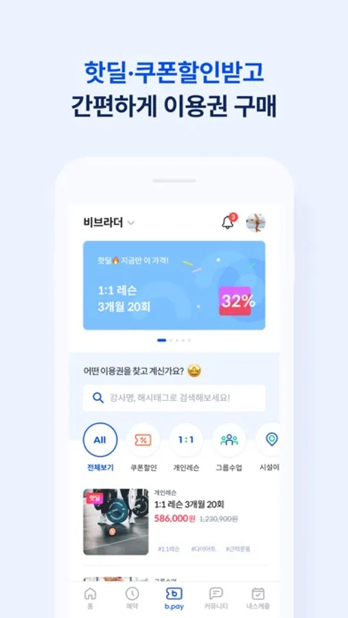 파격 할인 핫딜, 모바일 할인 쿠폰으로 저렴하게 피트니스 센터 이용권을 구매하고 바로 실시간 예약을 시작할 수 있습니다.