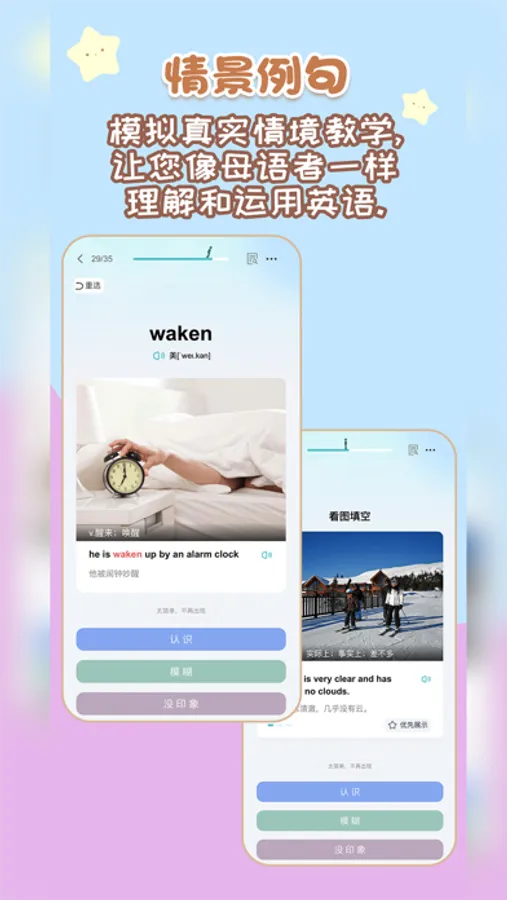 1、 通过情景图片,例句,视频等方式记忆单词,建立单词-情景直接反应的英语思维
