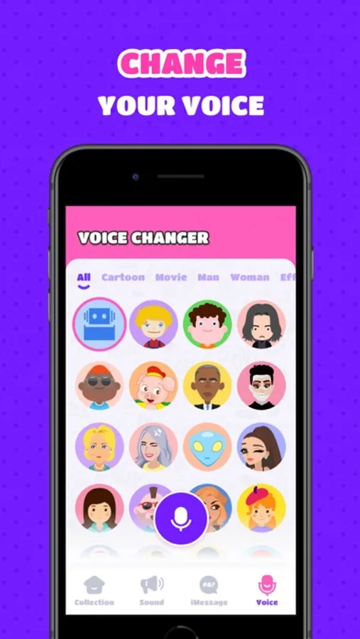 -Many options to make your voice sound like a famous cartoon character, an entertainer, or other figures including a robot, a zombie, an alien, a devil, and more.