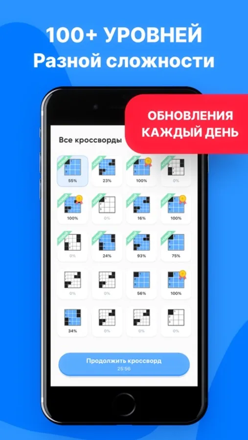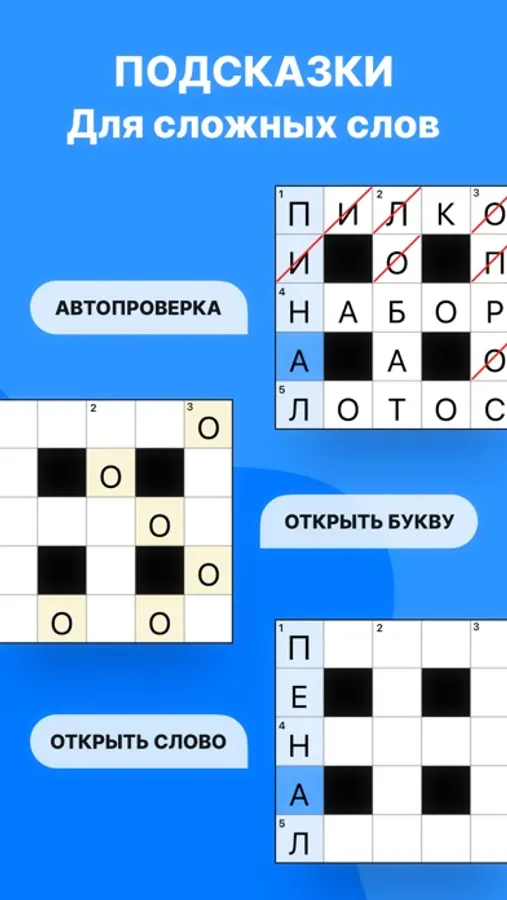 Если вам нужна помощь откройте подсказки по раскрытию слова или только букв и решите кроссворд с подсказками. Начните игру с простых и легких уровней и дойдите до самых сложных. Проверьте свою логику и внимательность! Проходите кроссворды и умные головоломки каждый день.