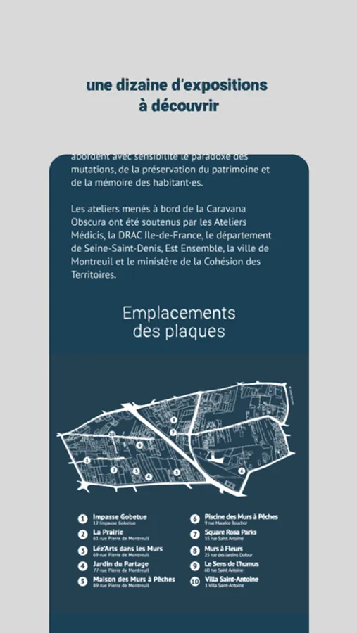 Partez à la découverte des différents contenus multimédias que l’artiste a réparti à travers 10 lieux des Murs à Pêches, chacun signalé à son entrée par une plaque en céramique bleue à scanner depuis l’application Murama.