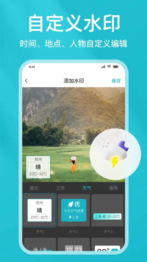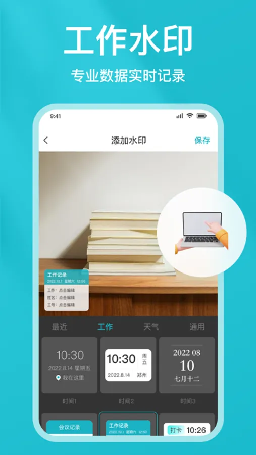 图片水印:从水印库中选择所需水印,然后从相册选取或拍摄照片将水印附加在图片上