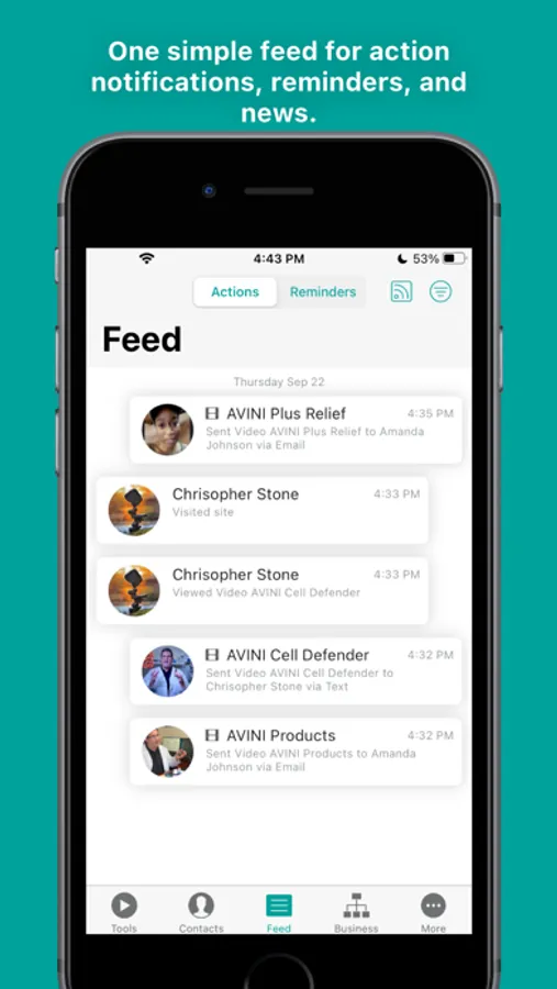 Contacts: Choose how to sync and manage your contacts. Swipe to sort them by interest level. You can make connections, add notes, or check out the Contact Feed to see the tools you’ve shared and contact actions.