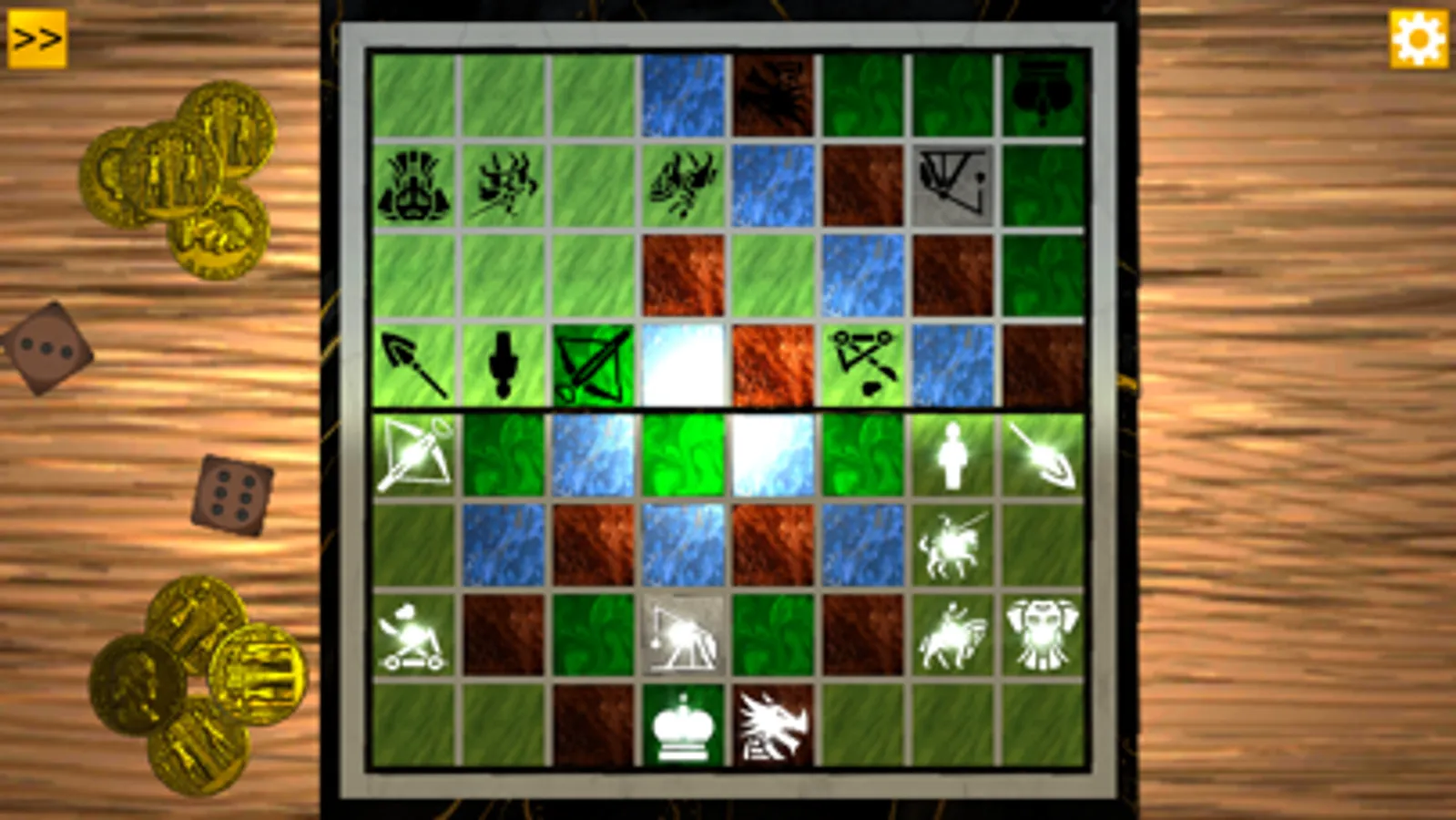 The board consists of an 8 by 8 play area with 64 tiles in total. Each half, referred to as a homeland, is an area of 8 by 4 and is separated at the start of the game by a screen providing sufficient cover so as each player cannot see the other’s homeland. During this phase each receives their tiles and may construct their homeland by placing tiles according the each of the tile’s attributes and considerations as defined below. After the tiles are arranged, players then place their pieces. Once both players have agreed that they are finished the screen is removed and play commences.