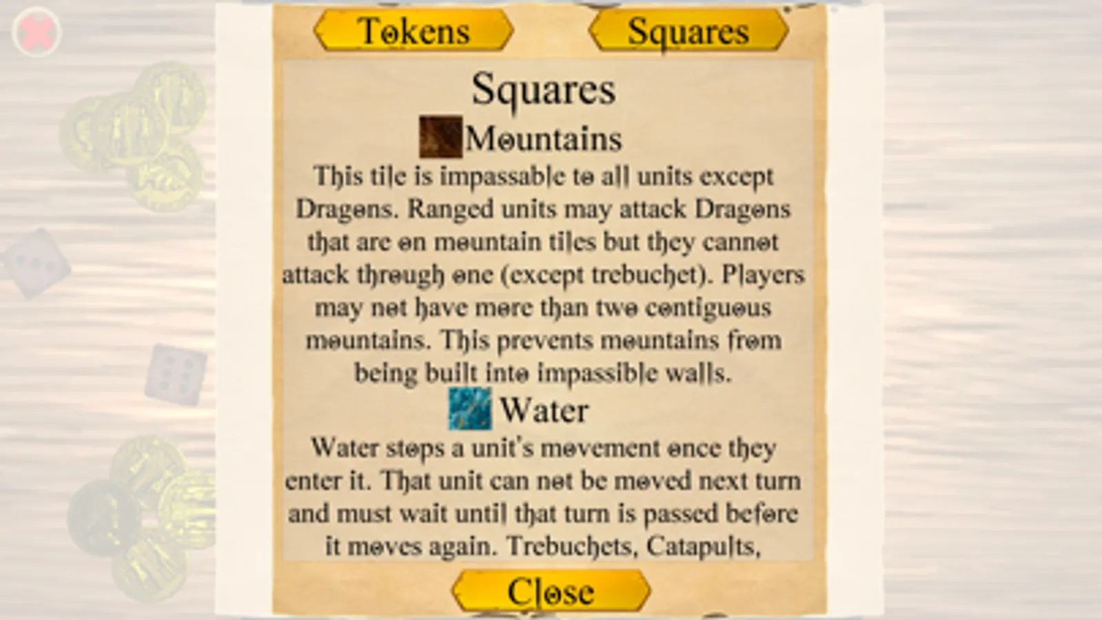 - Mountains: This tile is impassable to all units except Dragons. Ranged units may attack Dragons that are on mountain tiles but they cannot attack through one (except trebuchet). Players may not have more than two contiguous mountains. This prevents mountains from being built into impassible walls.