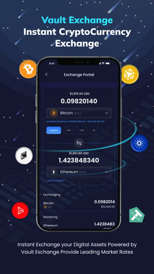 • Vault Wallet Cryptocurrency Exchange with Leading Market Rates across all available Digital Assets