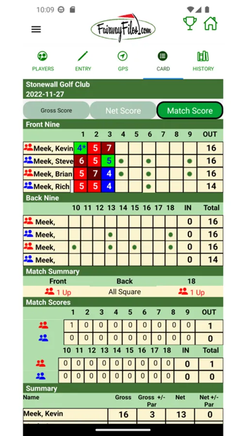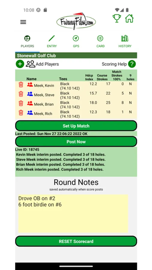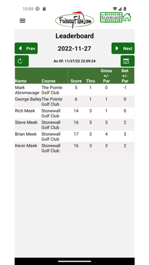 Scores and stats are posted in real time to the Fairwayfiles.com website, where your golf history and stats are stored and viewable by your friends either via the app or via browser. You can view your friends' recent rounds and their statistics, and track their play in real time on the daily Leader Board.