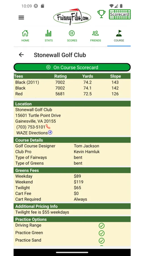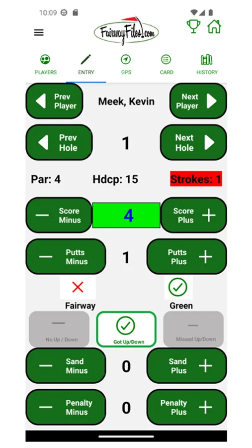 Fairway Files Golf Scorecard is the companion app for FairwayFiles.com, a totally free golf scorecard tracking system. It supports on course entry of your golf scores as you play, providing color coded scorecards, coloring pars, birdies, bogies, eagles etc. Toggle between net and gross score and match scores based on your Fairwayfiles Index. Track stats including Fairways hit, Putts, Greens in Regulation (GIRs), Penalties, Sand Strokes and Up/Downs. Review your stats to know what part of your game to work on!