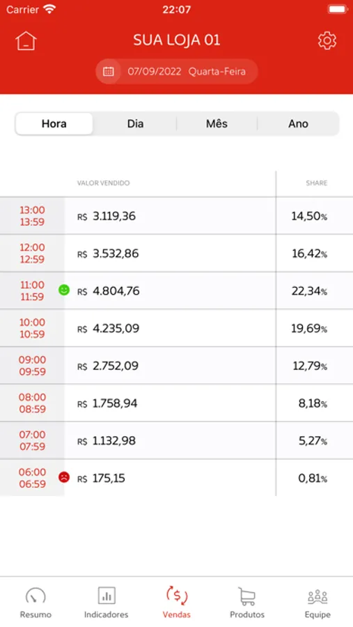 • Análise diária: melhor e pior hora das vendas no dia da semana selecionado