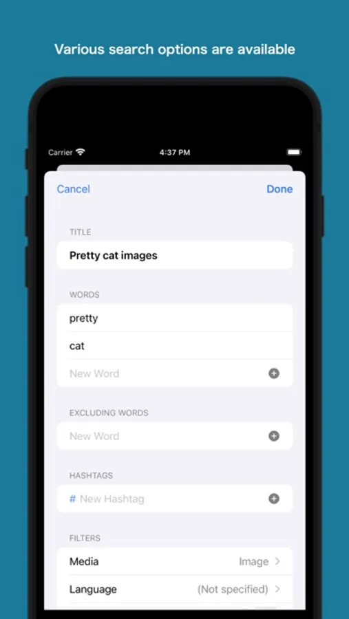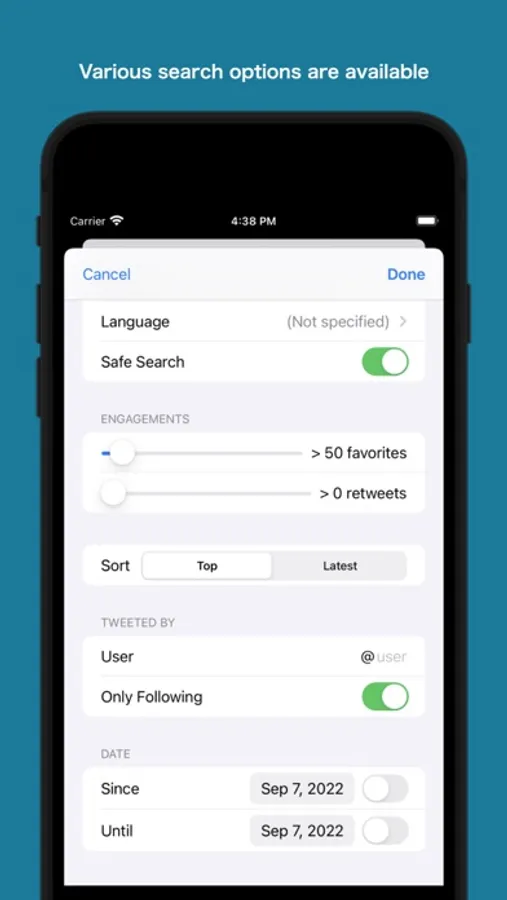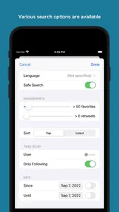 This application is a tool to easily configure and also manage each option of Twitter Advanced Search.