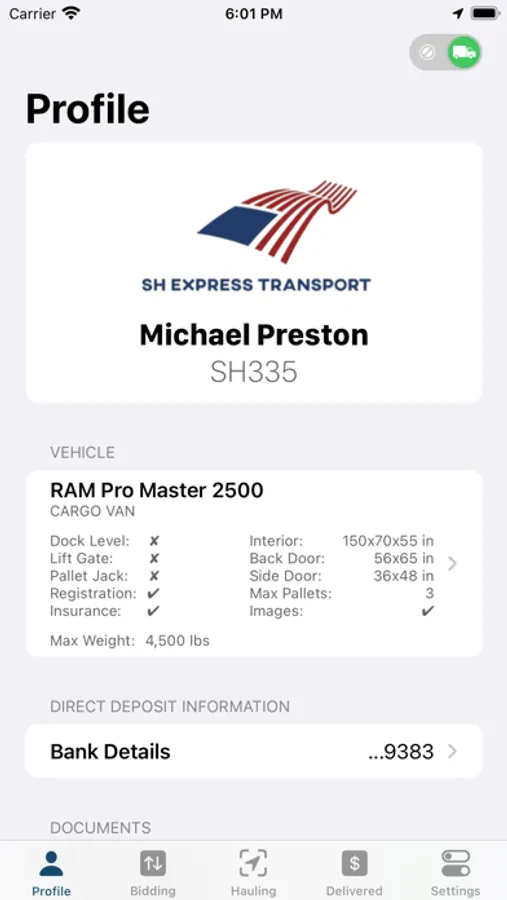 Before you can use the app, your account must be verified by SH Express Transport Inc. Note that all equipment (such as cargo van, sprinter or small straight) must be under 10,000 lbs.