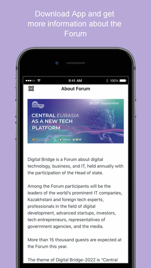DigitalBridge is a mobile application developed specifically for the international forum on digital technologies, business and IT, which will be held on September 28 and 29, 2022 at the Expo IEC, Nursultan, Republic of Kazakhstan.