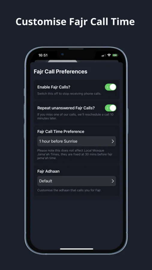 Fajr Calls - we hate alarms, that alarm noise is psychologically embedded into our brains as an annoying noise. Phone calls on the other hand suggest urgency, with this in mind we've found calls are a super effective way to wake up. Fajr is now one call away!