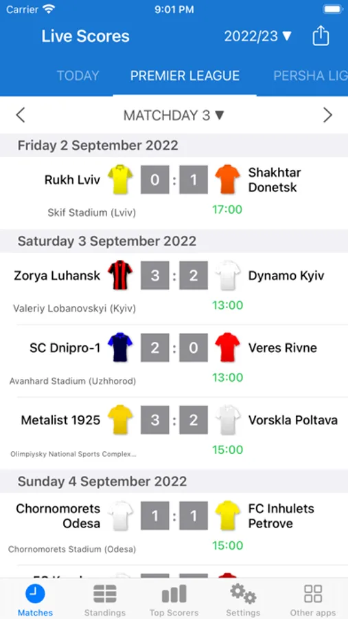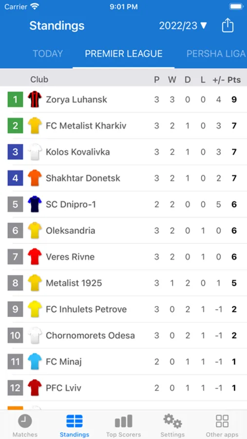 Live Scores for Ukrainian Premier League 2023/2024 is the app that will allow you to follow the matches of Football Championship in Ukraine, even you do not have possibility to watch TV or live stream. It includes a calendar, schedule of matches, standings and results of Premier League, Persha Liga, Ukrainian Cup and Super Cup. With the application you will not miss a goal or begin of a match, because it will send you a push-notifications. You can select favorite matches and receive notifications only for them. In Ukrainian Premier League season 2023/24 play the teams: Rukh Lviv, Vorskla Poltava, FC Polissya Zhytomyr, FC Obolon Kyiv, Kryvbas, Veres Rivne, Oleksandriya, Shakhtar Donetsk, Dynamo Kyiv, FK Zorya Luhansk, Kolos Kovalyovka, LNZ Cherkasy, Minaj, Chornomorets Odesa, Metalist 1925 and Dnipro-1.