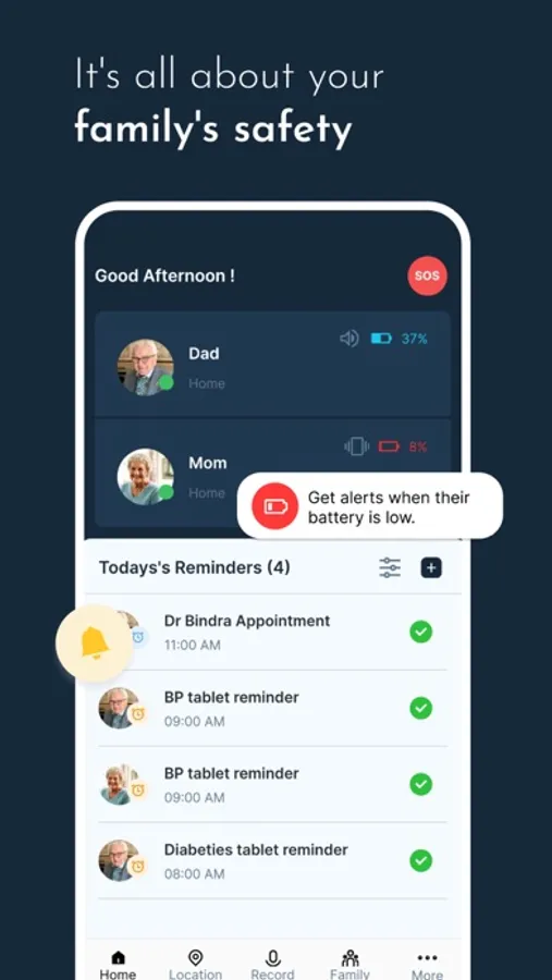 At FamConnect it is our mission to ensure your family's safety with comprehensive location tracking and SOS features that keeps you tension free. We offer a peace of mind app that's designed for your needs, from reminders to tracking, to even 24/7 emergency responders.