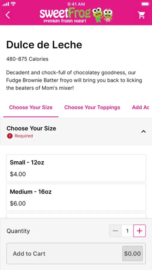 Welcome to sweetFrog® — where our goal is to create the best frozen yogurt experience you've ever had! You create your own combination of delicious, soft-serve premium frozen yogurt then finish it off with any toppings you choose. Our toppings bar is stocked fresh every day with the best ingredients for a light snack, a decadent dessert and everything in between.