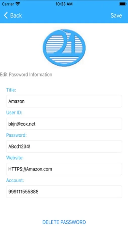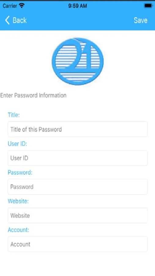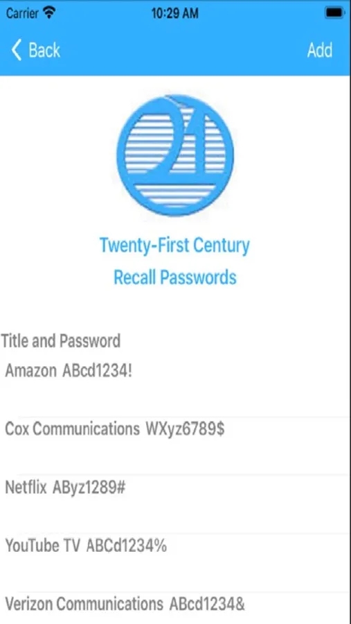The Twenty-First Century Recall Passwords App allows you to store all of your password information for various accounts. The information includes title, user id, password, website url and account number.