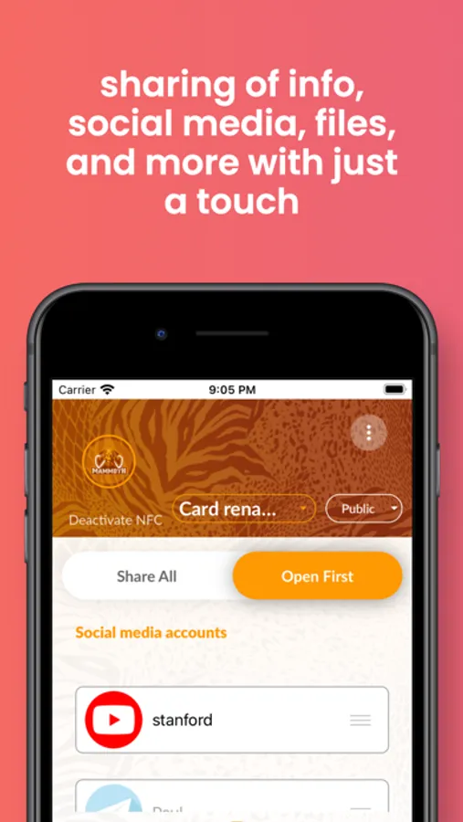 Mammoth app allows you to customize both a personal and a business profile, so you are able to connect with others at any event at any time just by scanning NFC tag.