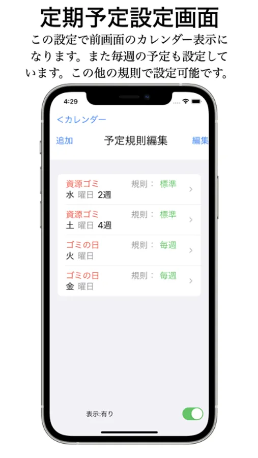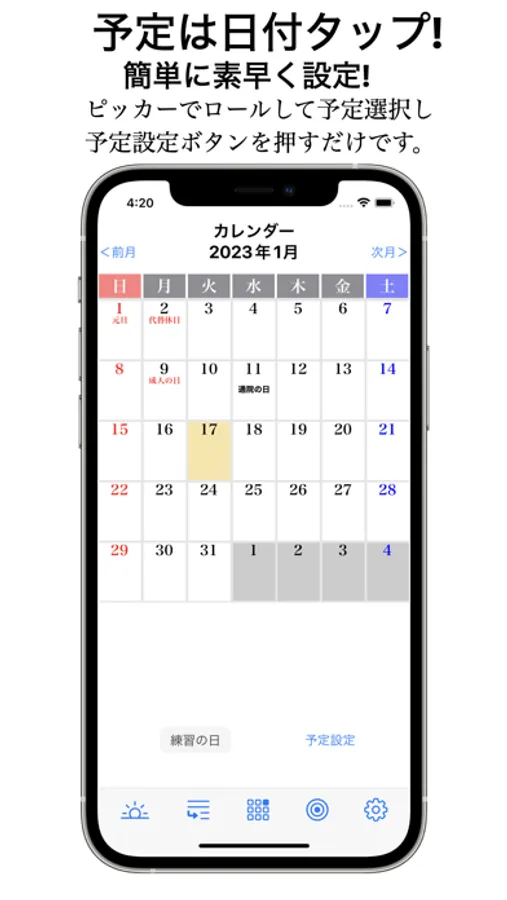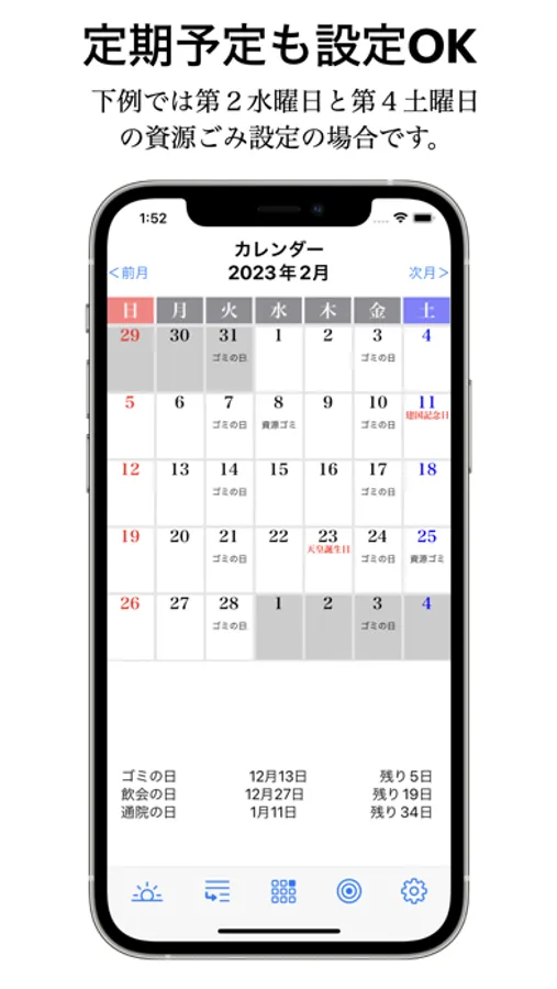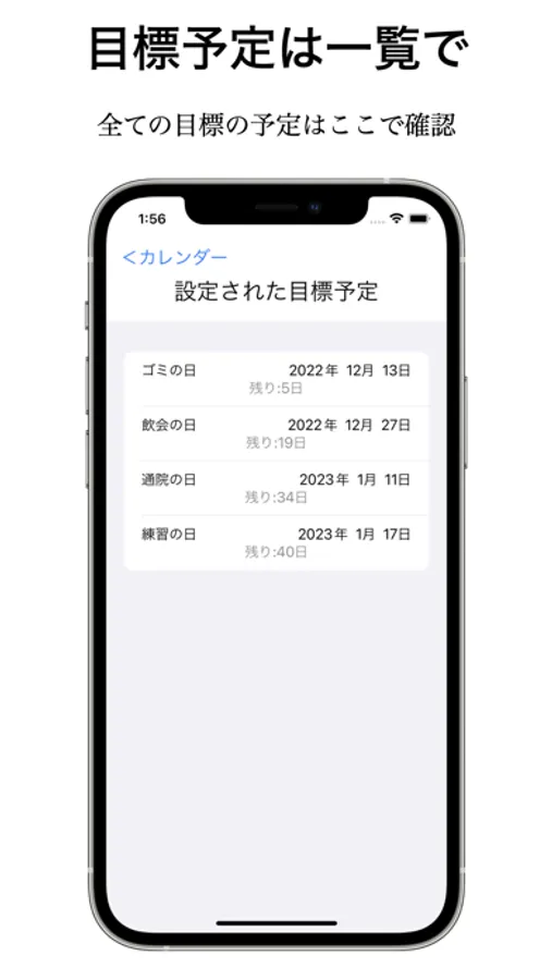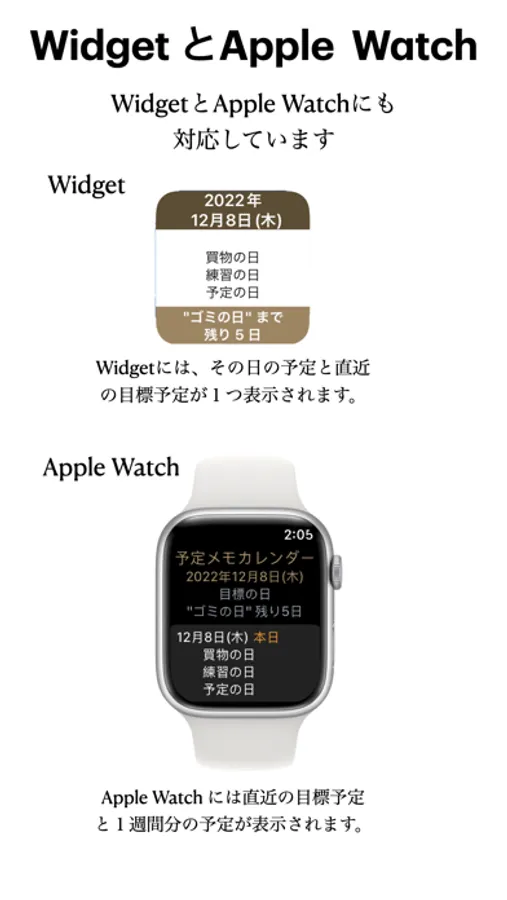 使用者が設定した予定を本アプリのカレンダー上に表示します。予定はカレンダー上の予定日をシングルタップすることで設定することができます。設定した予定が今日から何日後なのか表示する機能があります。資源ゴミなどの定期的な予定も設定することにより表示することができます。また本アプリはウェジットに対応しています。ウェジット画面には本日の日付の他に本日の予定と目標設定した最新の予定まで残り何日あるか表示されます。さらにApple Watchにも対応しています。ウェジットと同様にiPhone上の本アプリと連動しており本日から1週間分の予定を確認することができます。