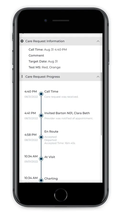 * Displays important information about the visit, including the patient’s location, on a map.