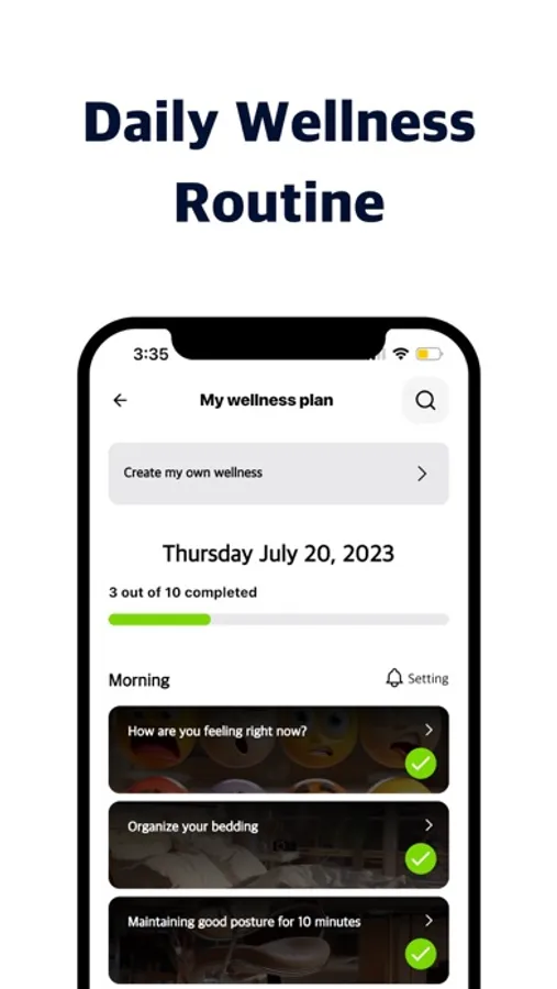 - Wellness activities such as meditation, quotes, rituals, journaling, emotional diary, breathing, and mindfulness