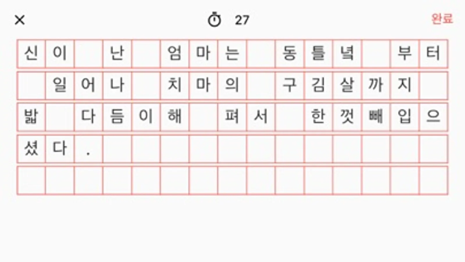 한 문제는 30초(일부 45초)의 제한 시간이 있으며, 제한 시간 내에 정확한 문장을 완성하는 퀴즈입니다.
