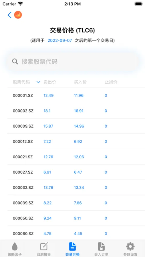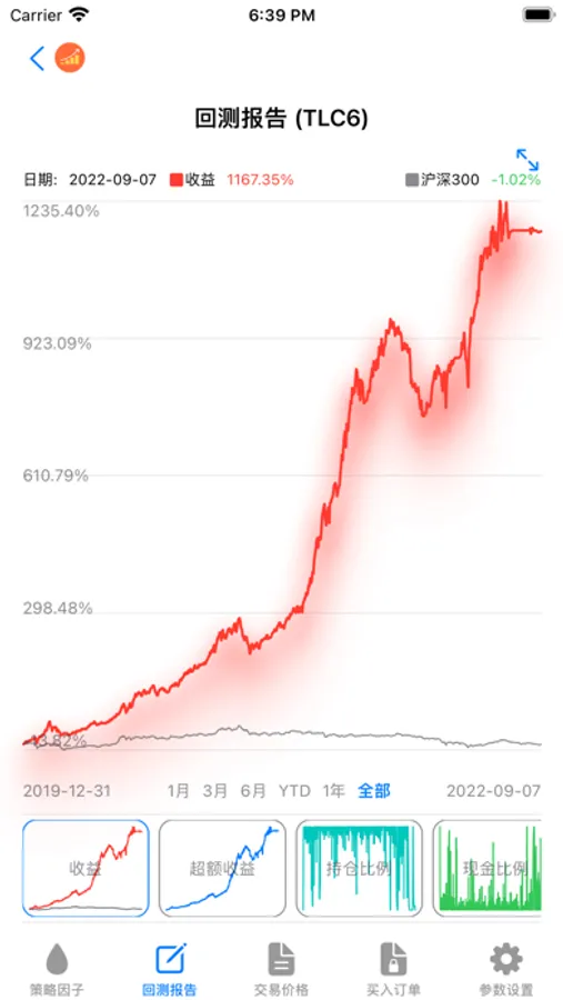 交易策略:包括策略因子、回测报告、交易价格、买入订单、参数设置。策略因子:包括买入策略、卖出策略、买入价格、卖出价格和止损价格;回测报告:包括绝对收益率、超额收益率、持仓比例、现金比例、持股个数、净值变动;交易价格:是指下一交易日的交易价格,个股k线图自动提示买卖点;买入订单:是指下一交易日可以买入的个股清单,当市场价格触及或者低于预定的买入价格时,触发买入;参数设置:包括回测日期区间、交易参数、股市指数、股票池以及指标参数,其中,指标参数不与电脑端软件同步。