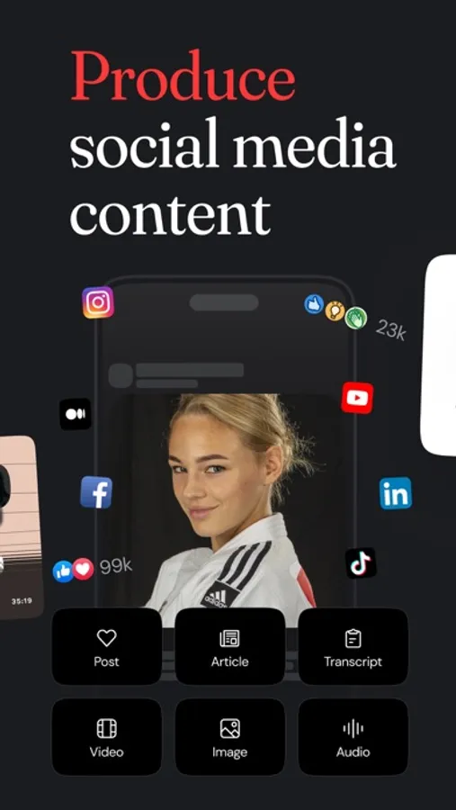 - Produce videos, images, quotes, articles, and captions in seconds.