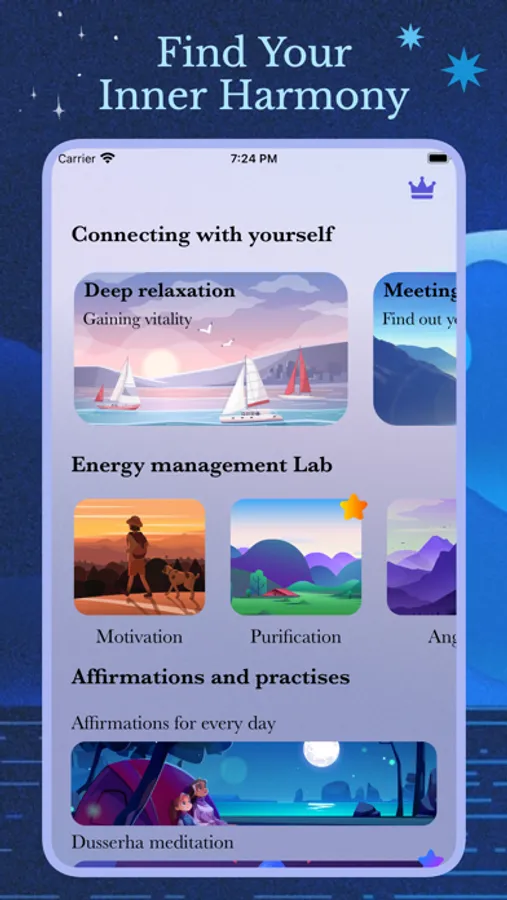 The application contains three main categories: connecting with yourself, aimed at establishing a connection with the inner child and with the real Self; an energy management lab where you can learn how to manage your emotions and hone your mood selection skills; traditional guided practices and affirmations, where you can not only strengthen your self-esteem, but also learn ancient meditation practices that permeate hundreds and thousands of years of wisdom, harmony and greatness.