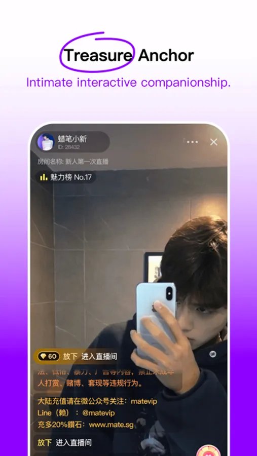 As an entertainment Live broadcast platform, Mate also focuses on live chat social interaction. Mate provides video and voice live chat rooms, comment functions, so that handsome male anchors and users can exchange friends and share views. In addition, the platform encourages more intimate connections between anchors and users, enhancing social interaction and goodwill through likes, gifts and comments.
