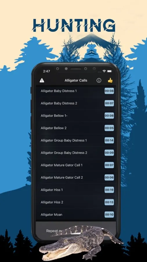 You can play the sounds individually and set them to repeat after the amount of seconds that you desire. Or you can manually tap different alligator hunting calls to create a deadly combination of calls that will work perfectly for the alligators you are hunting.