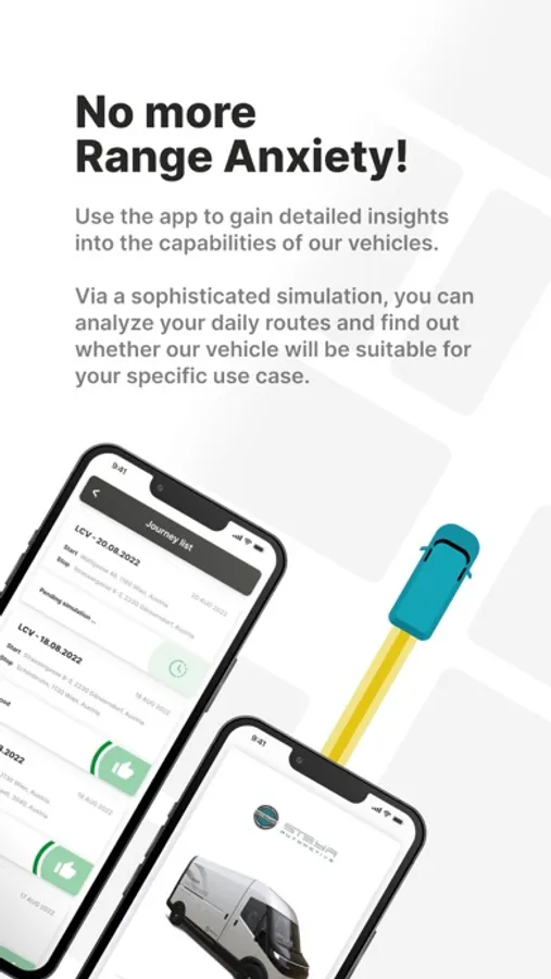 Use the app to gain detailed insights into the capabilities of our vehicles. Via a sophisticated simulation, you can analyse your daily routes and find out whether our vehicle will be suitable for your specific use case.
