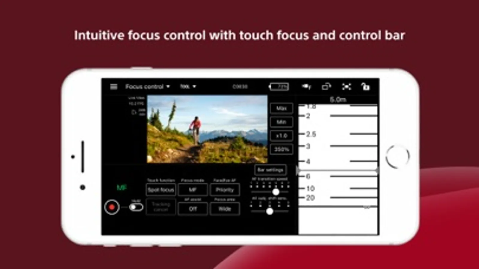 Access to various focus functions*, including touch focus and AF sensitivity adjustment. A control bar on the side of the screen enables intuitive focuse setting.