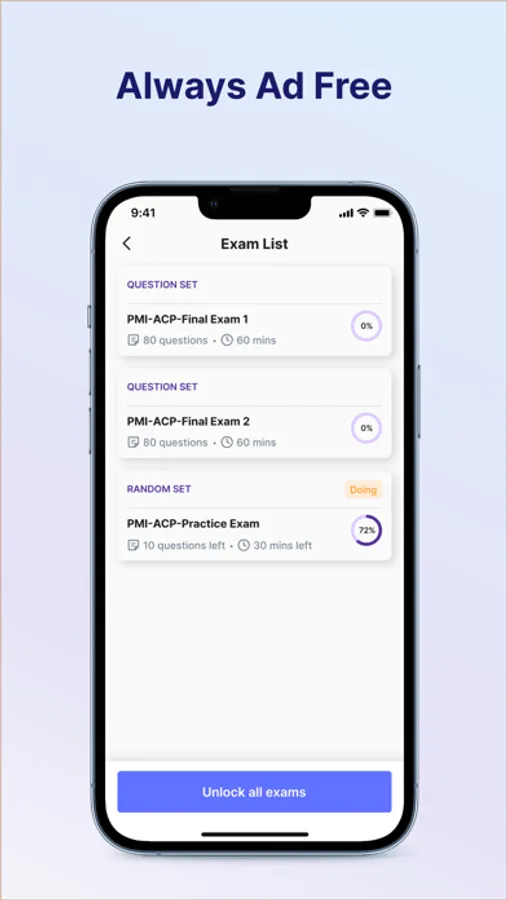 We consistently update our question database with authentic exam content. By regularly practicing with our tests and aiming for a minimum score of 75% across all your attempts, you'll be well-prepared to excel in the actual PMP examination. Download the PMP Exam Simulator now to acquaint yourself with the PMP exam. Our application is accessible from anywhere and at any time, providing you with flexibility in your exam preparation.