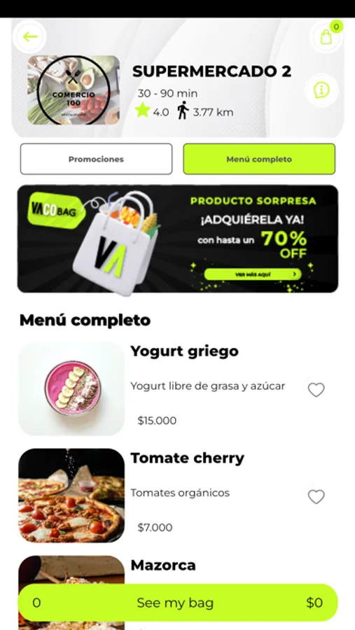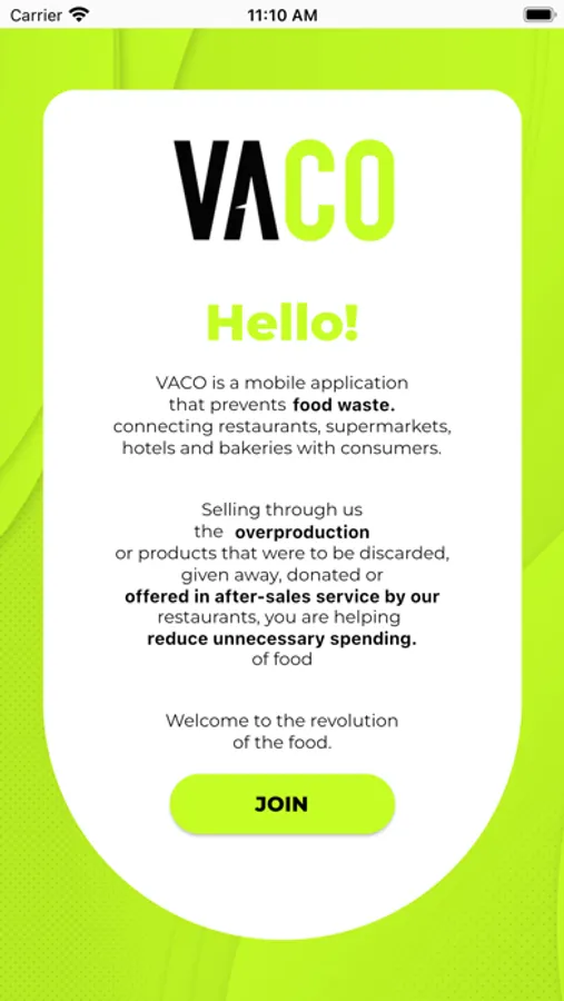 Vaco es una aplicación que te ayudará a contactarte con: restaurantes, supermercados y panaderías de los cuales podrás obtener ingredientes , productos y mucho más por un excelente descuento. Toda la comida que en VACO se venda tendrá un descuento nunca antes visto. Aca podras comprar todo aquello que más te guste, mientras que ayudas a que esa deliciosa comida no termine en la basura. Los restaurantes muchas veces producen más de lo que venden y a causa de no tener ventas suficientes miles de deliciosos platillos que nunca salieron de la cocina terminan en una tenebrosa bolsas de basura.. Así que poco a poco con VACO lucharemos con el desperdicio de comida y lo único que debes hacer es disfrutar de un delicioso platillo.