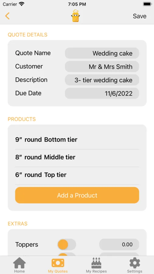 Add your overheads, ingredient prices and hourly rate to make sure you’ve covered your costs before adding a product to your quotation and whizzing it off to your clients!